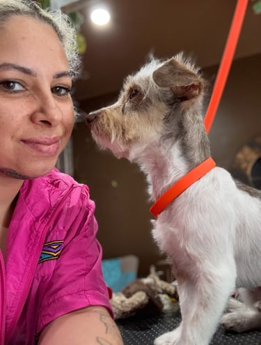 Ollie is one of my newest clients, we reached a full groom by our 4th session. In his evaluation session he exhibited extreme fight or flight that led to cowering, self-urination, then to biting, all the while on his Trazidone & Gabapentin. A strong collaboration with his family led the path to our success. With more time, our relationship will grow stronger and his trust in human touch will too!